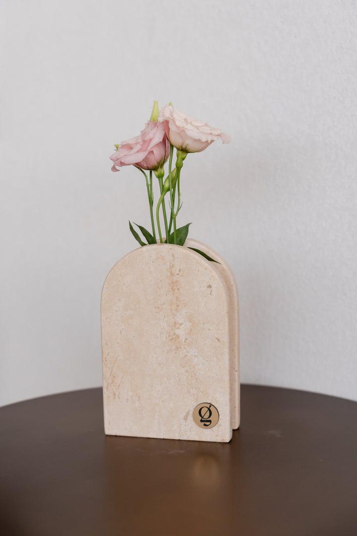 Inspirado en la armonía de los arcos y en la suavidad de las dunas, Áurea da cobijo a las flores como si las abrazara. El mármol revela su textura única mientras el cristal interior aporta ligereza y claridad. Un objeto pensado para acompañar la vida cotidiana con belleza tranquila y propósito.