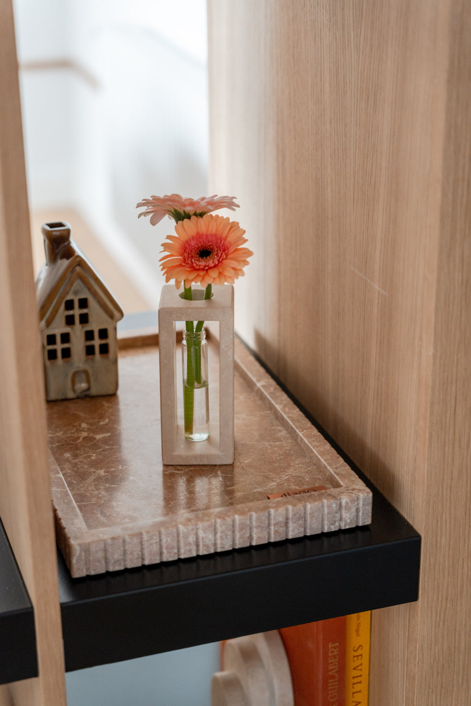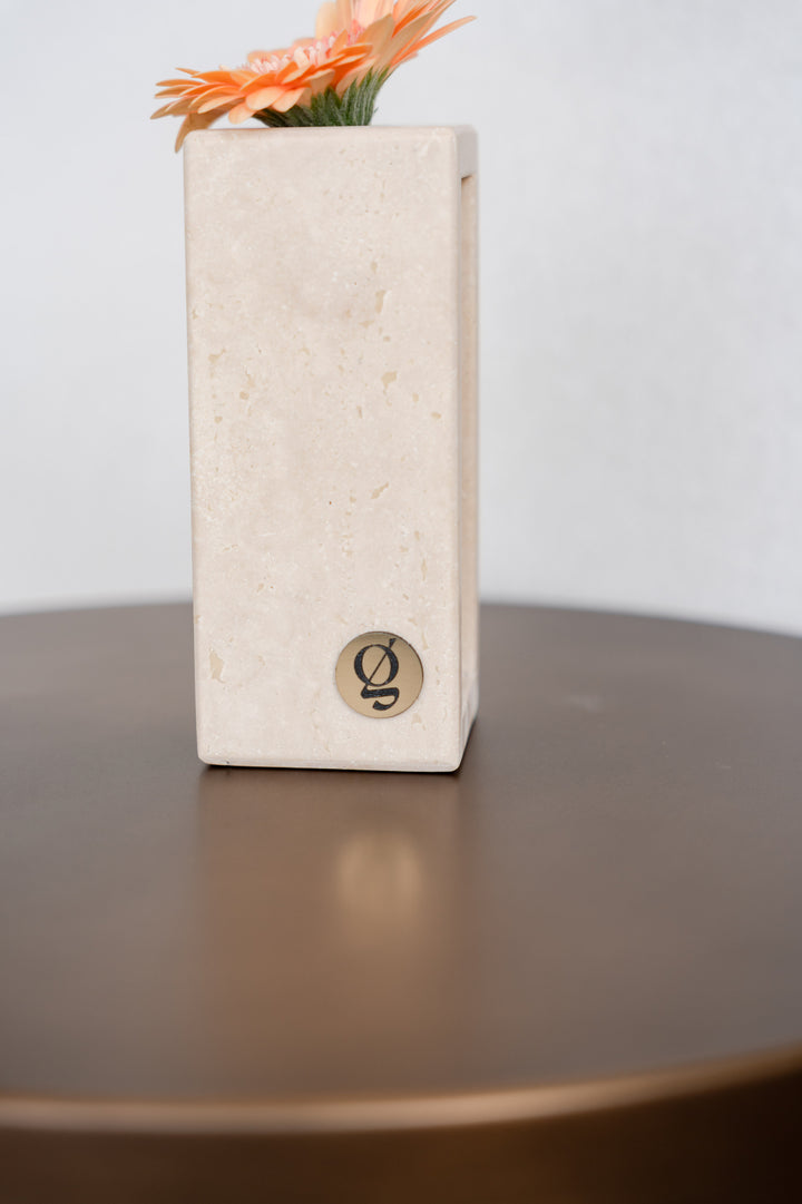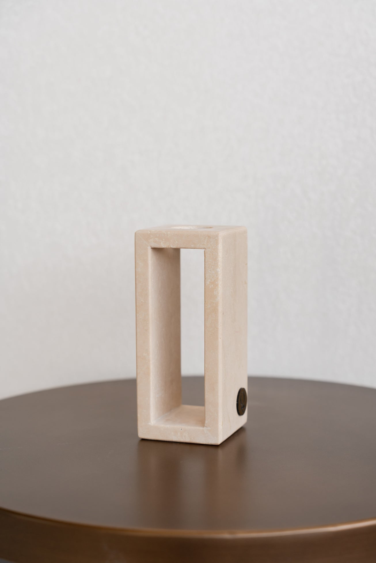 Brizna celebra la sutileza: un marco de mármol que envuelve un pequeño cilindro de cristal y deja que la luz atraviese la pieza. La naturaleza se convierte en protagonista mientras el mármol aporta calma, estabilidad y belleza serena. Un gesto mínimo que transforma cualquier rincón.
