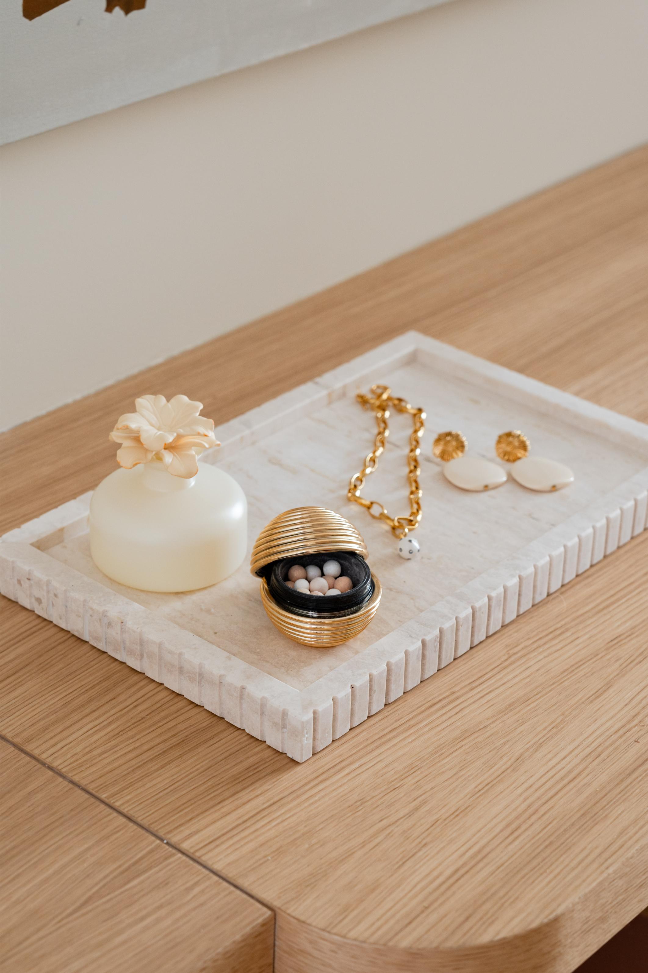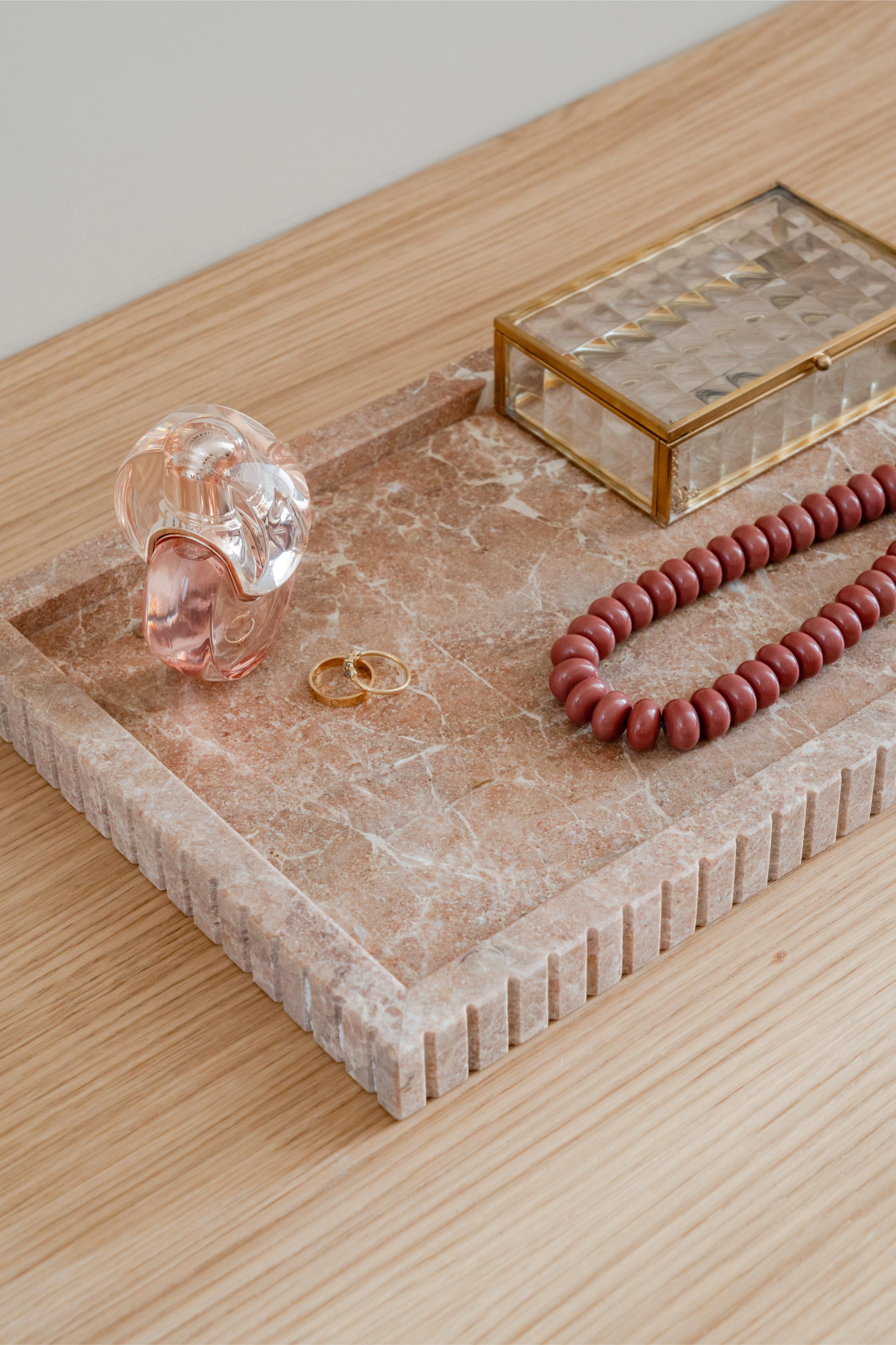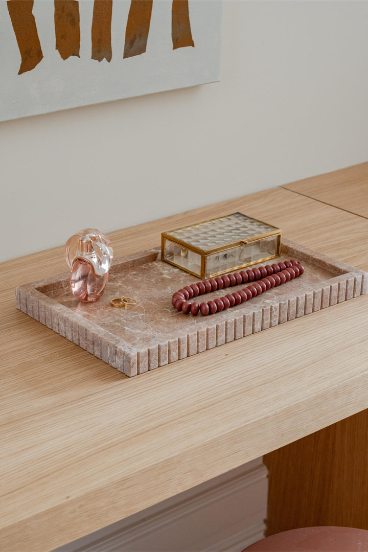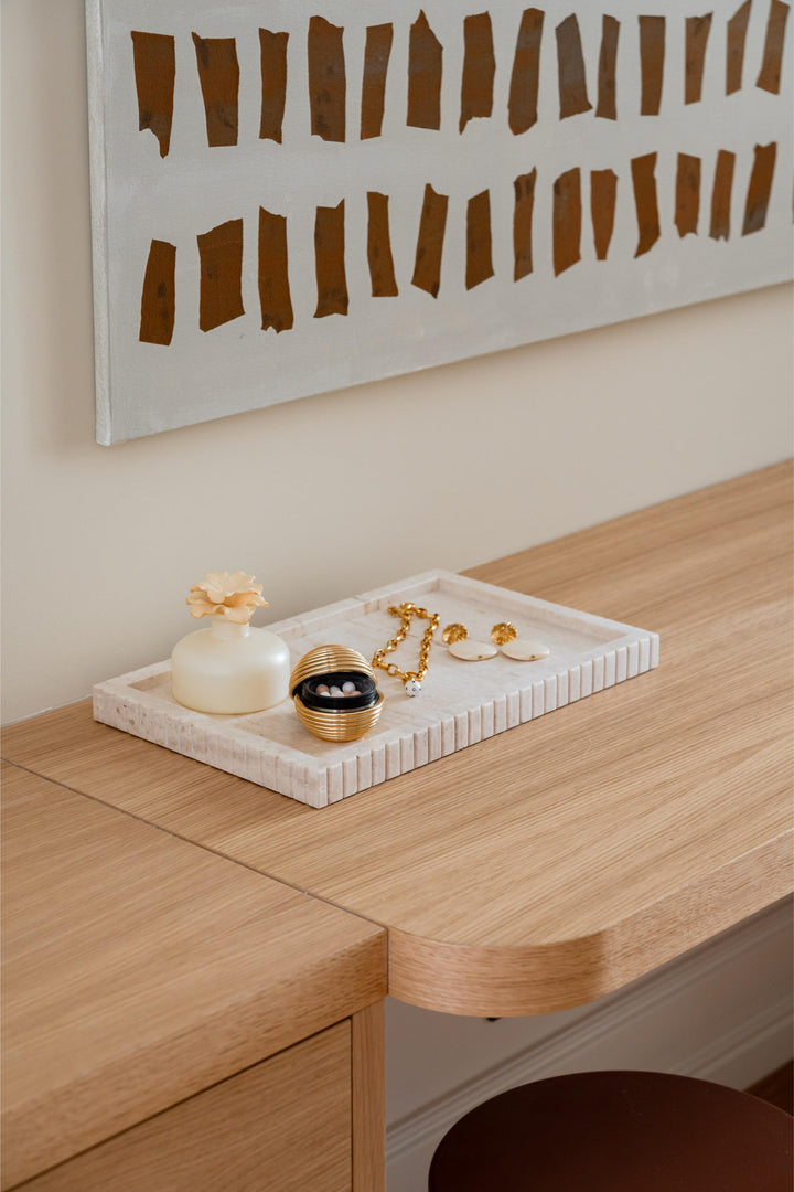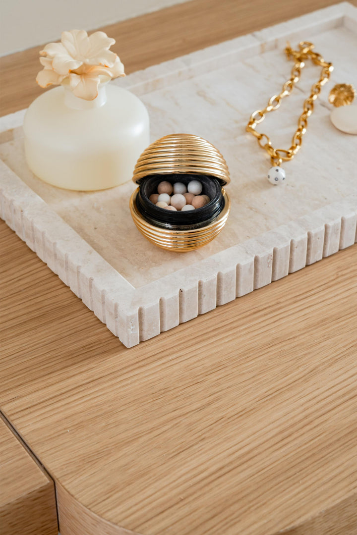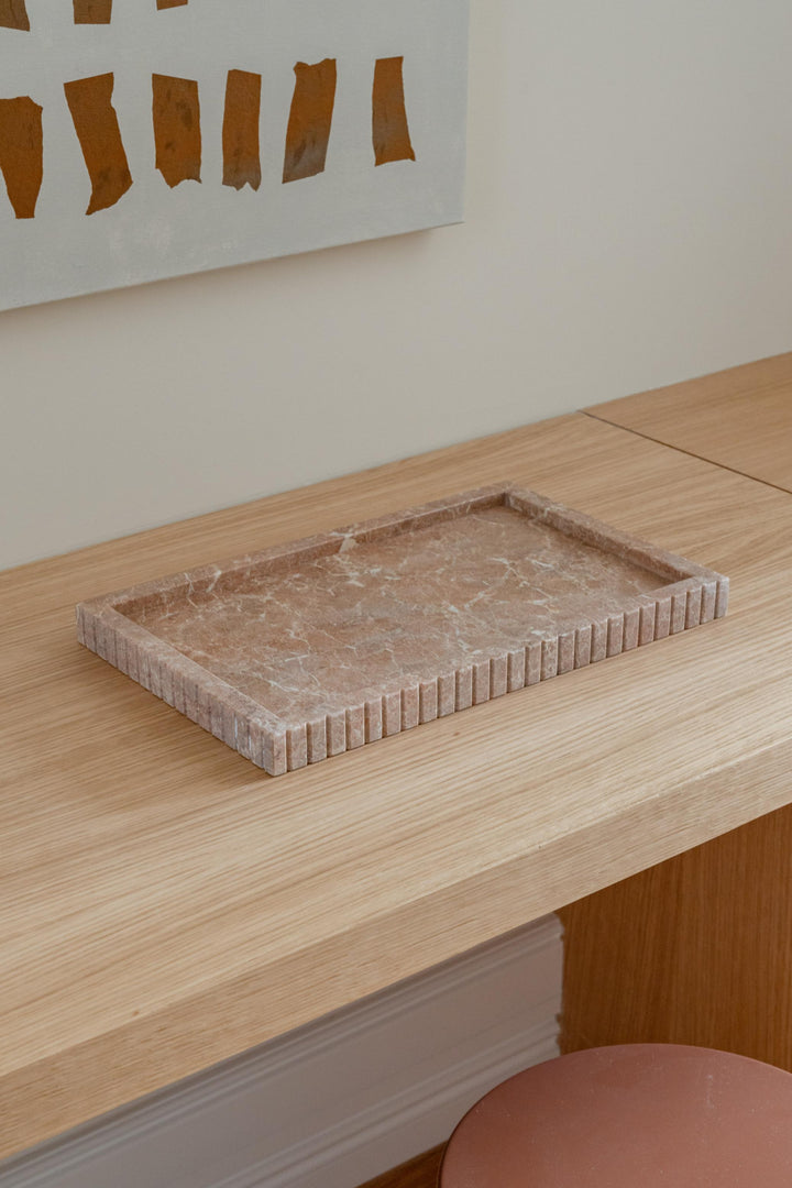 Bandeja de textura natural y acabado mate. Su diseño enfatiza la pureza de la forma y la honestidad del material. Ideal para espacios luminosos y neutros.