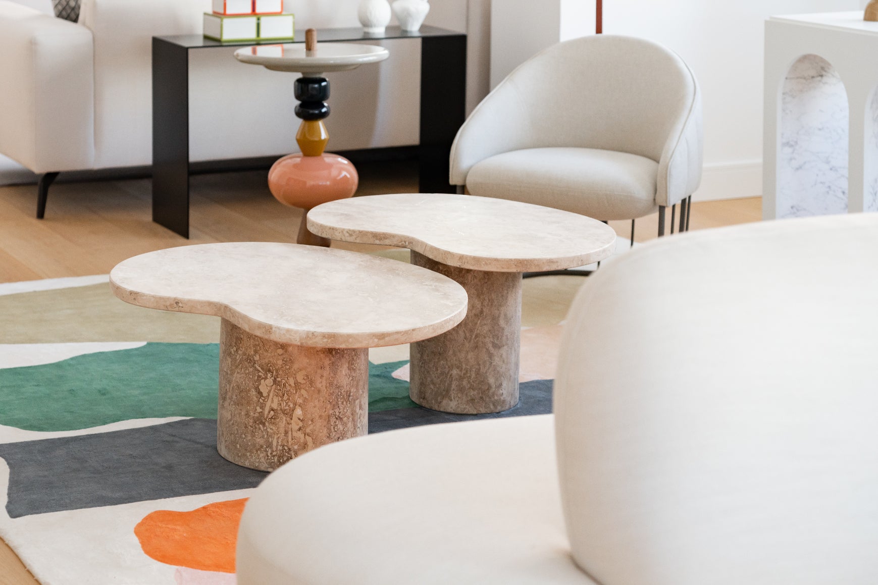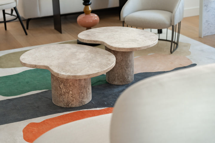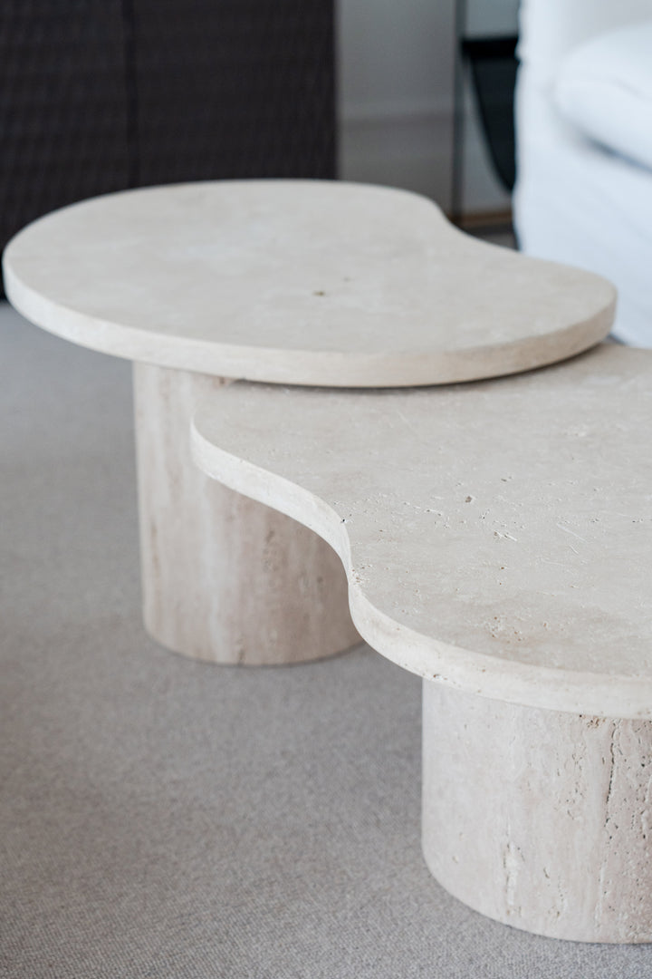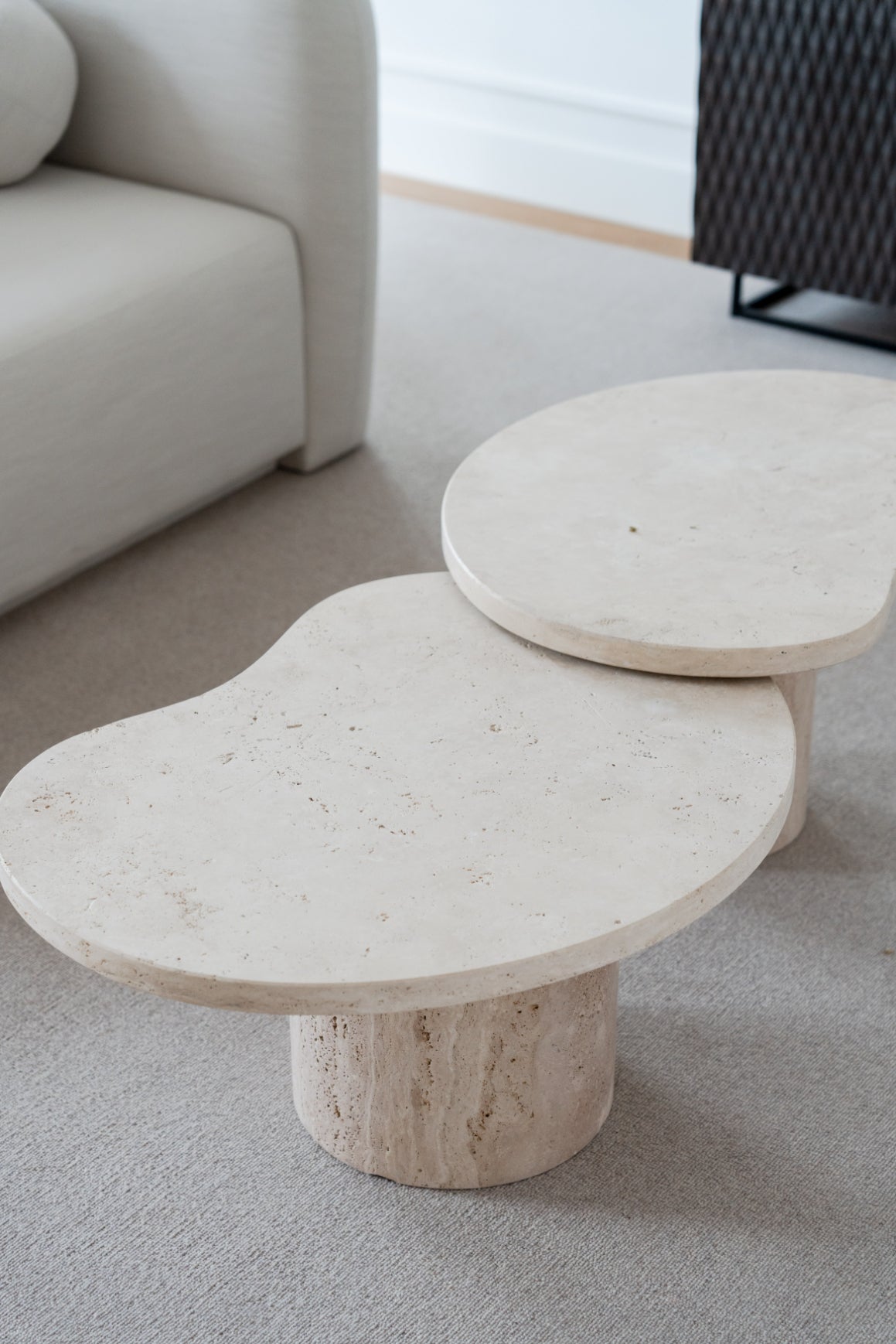La mesa melliza celebra la armonía entre forma y materia. Talladas en mármol travertino, sus siluetas orgánicas parecen dialogar entre sí, generando un equilibrio natural entre peso y ligereza.