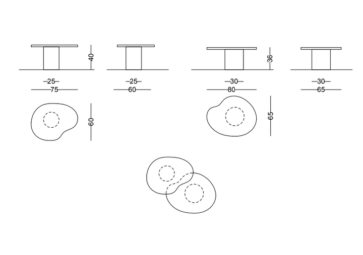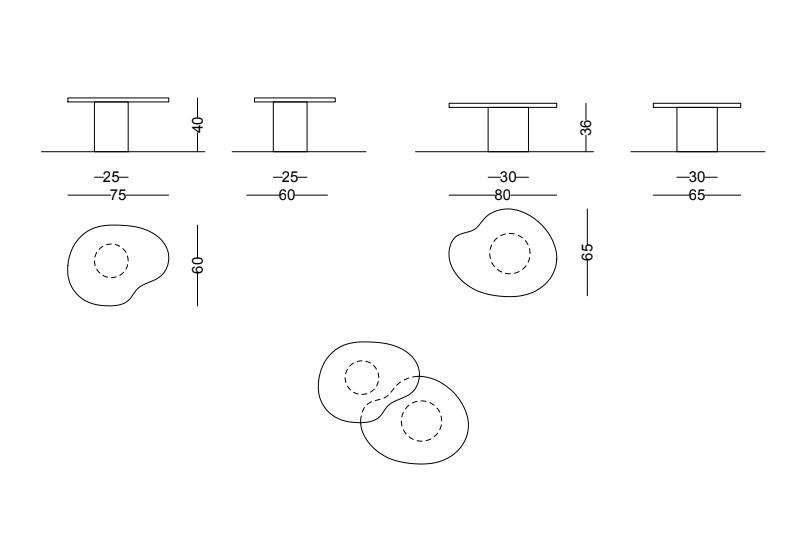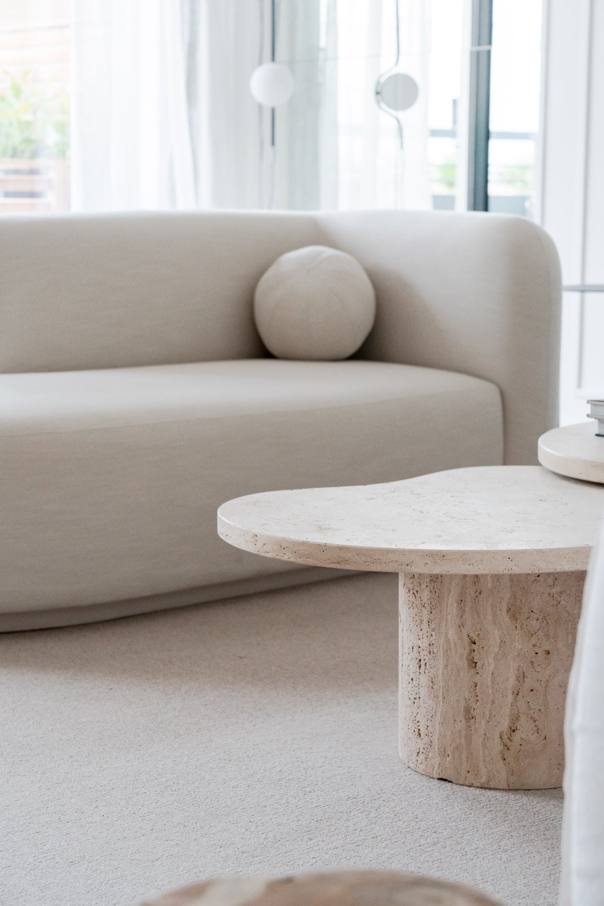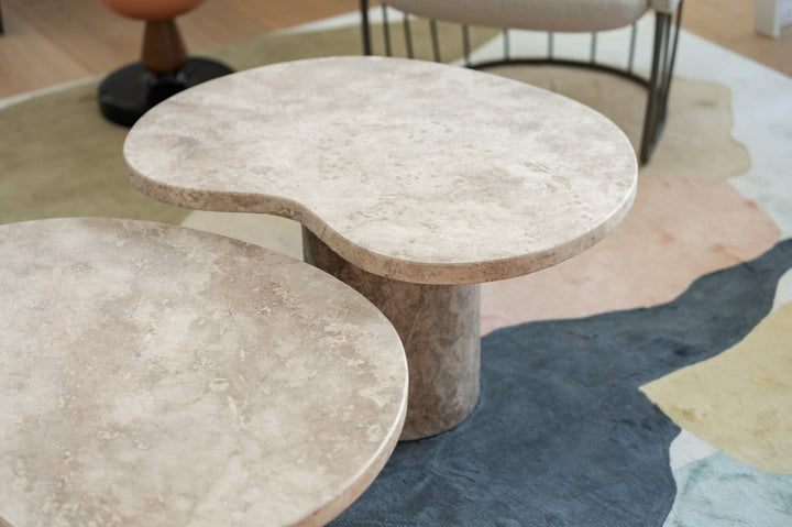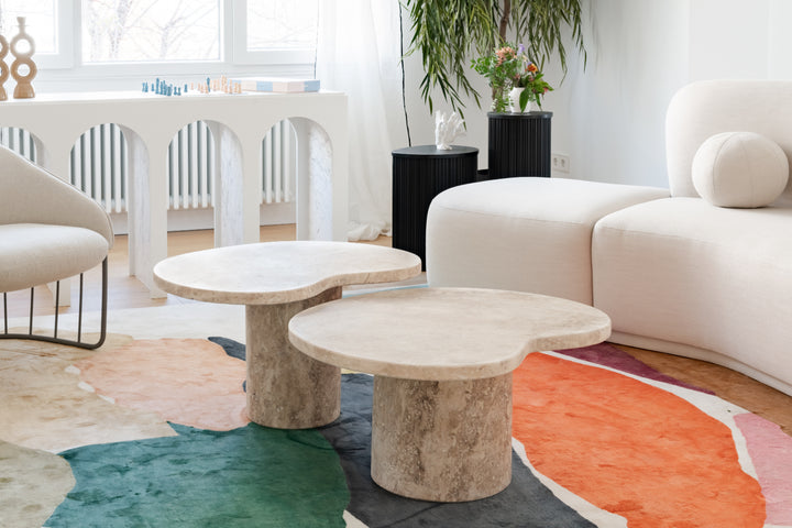 La mesa melliza celebra la armonía entre forma y materia. Talladas en mármol travertino, sus siluetas orgánicas parecen dialogar entre sí, generando un equilibrio natural entre peso y ligereza.