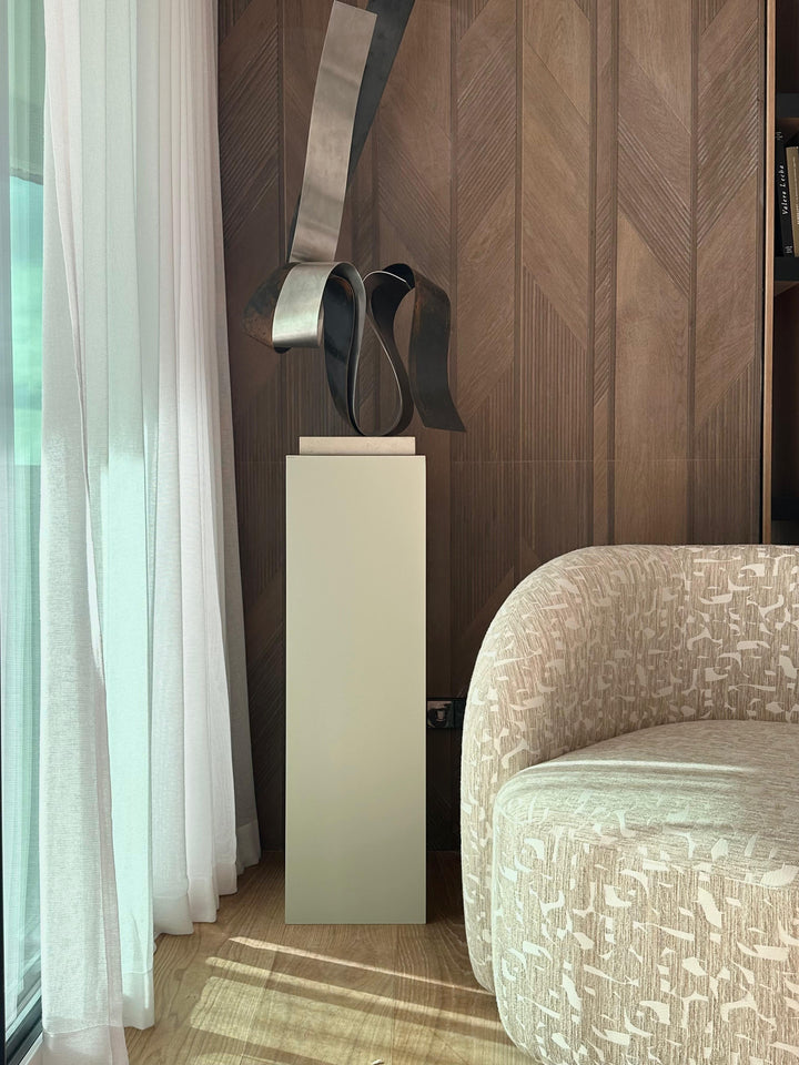 El pedestal Pilar, fabricado en robusto hierro y lacada en un elegante color cashmere, ofrece una base sólida y elegante para exhibir esculturas o jarrones. Su diseño minimalista y contemporáneo resalta la belleza de las piezas que sostiene, convirtiéndose en un elemento clave en tu decoración.