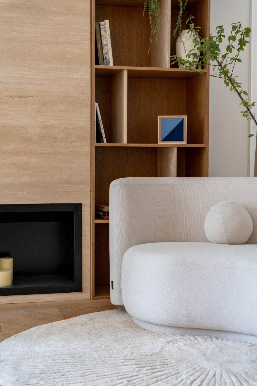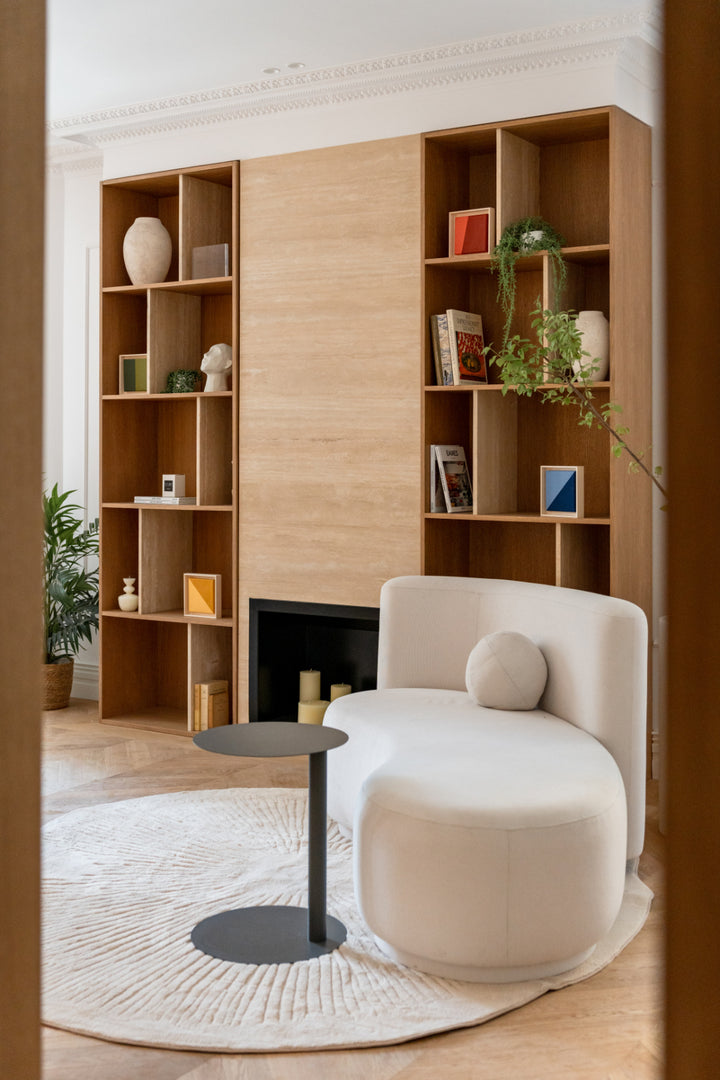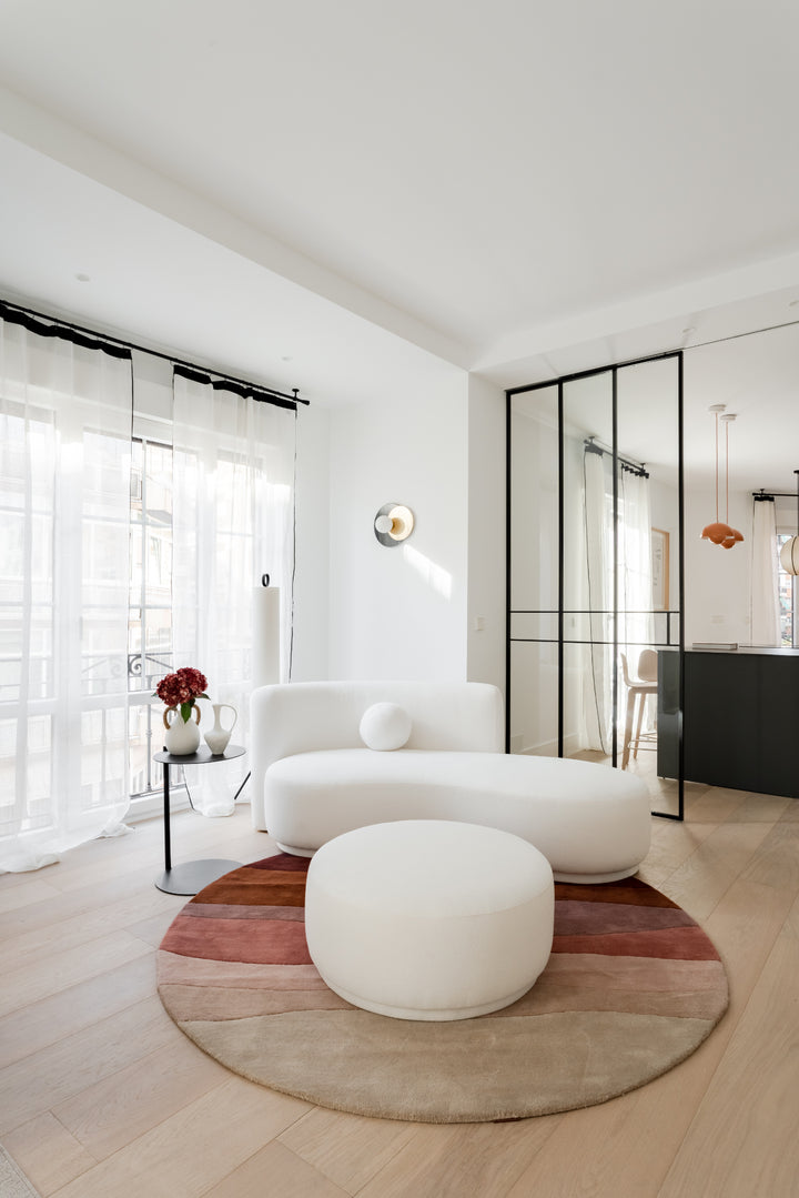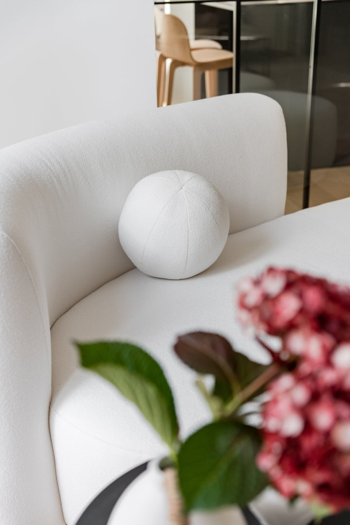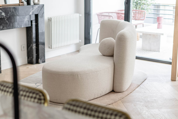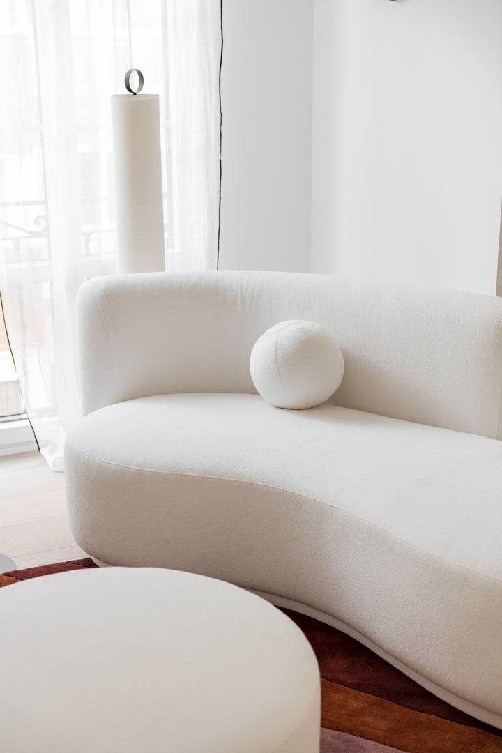 Luz comparte el lenguaje orgánico y envolvente del sofá Serena, pero en una versión de dimensiones más contenidas. Pensado para espacios íntimos, mantiene la misma fluidez de líneas y el mismo cojín esférico que caracteriza a la colección.
