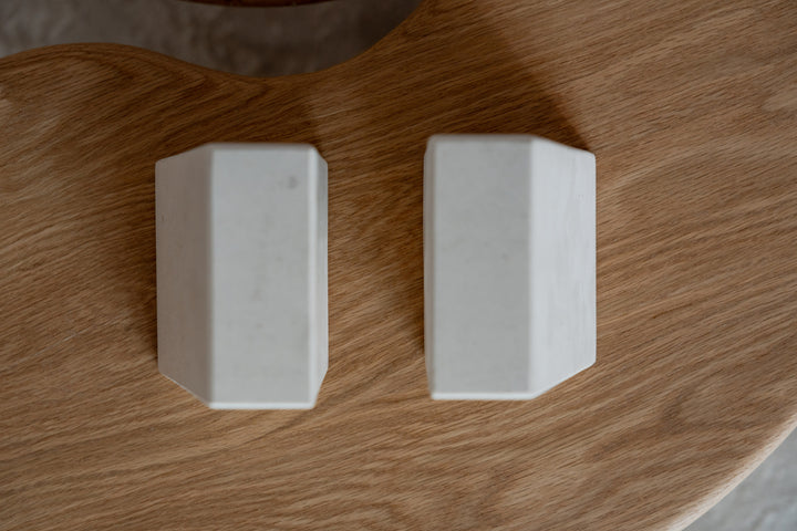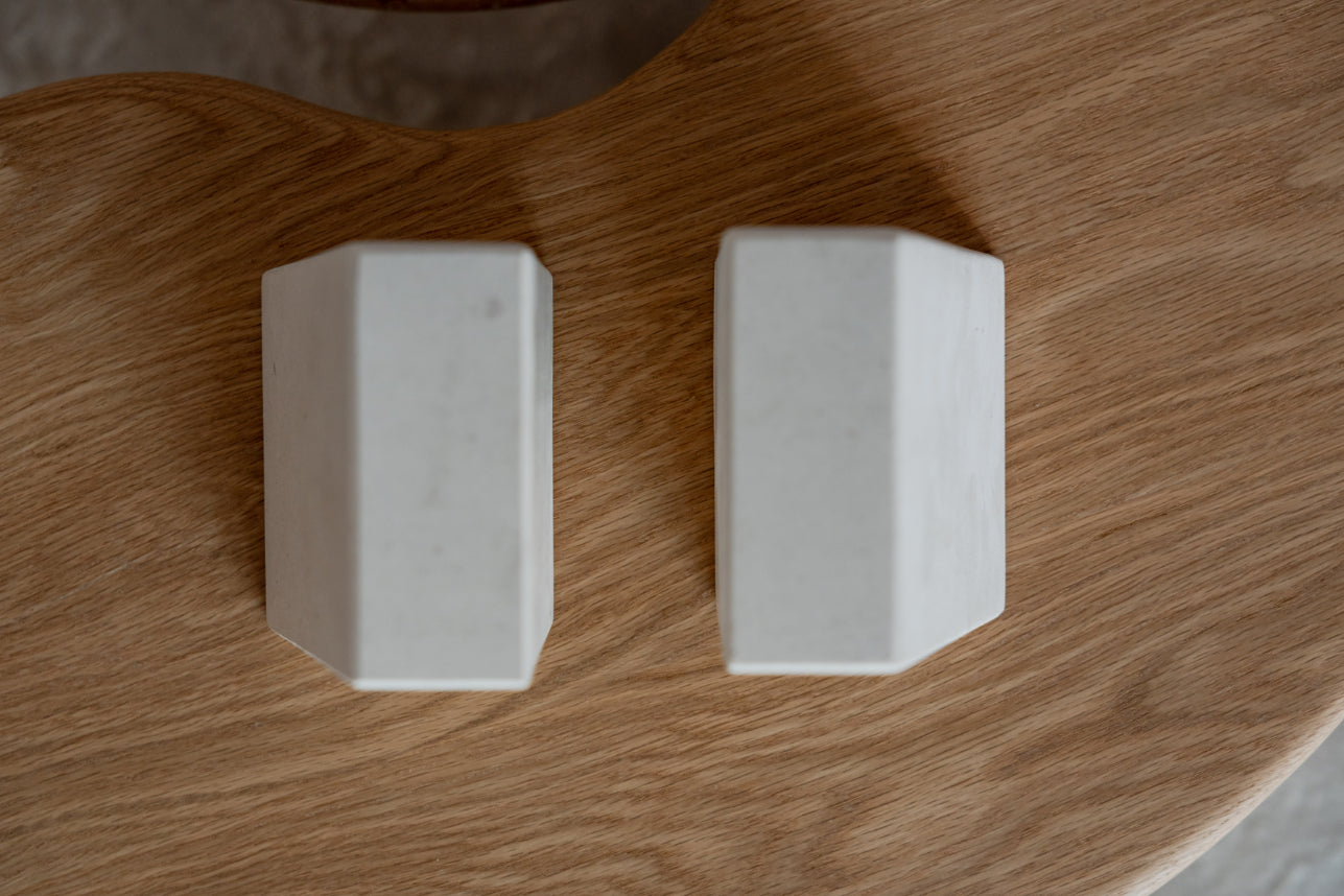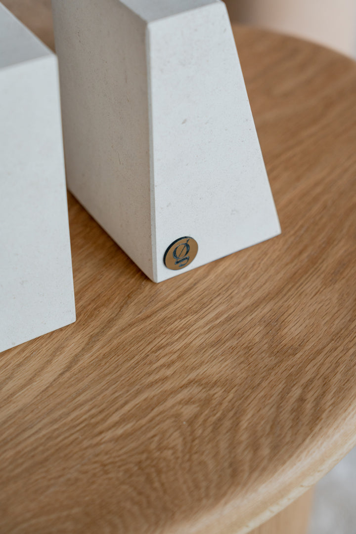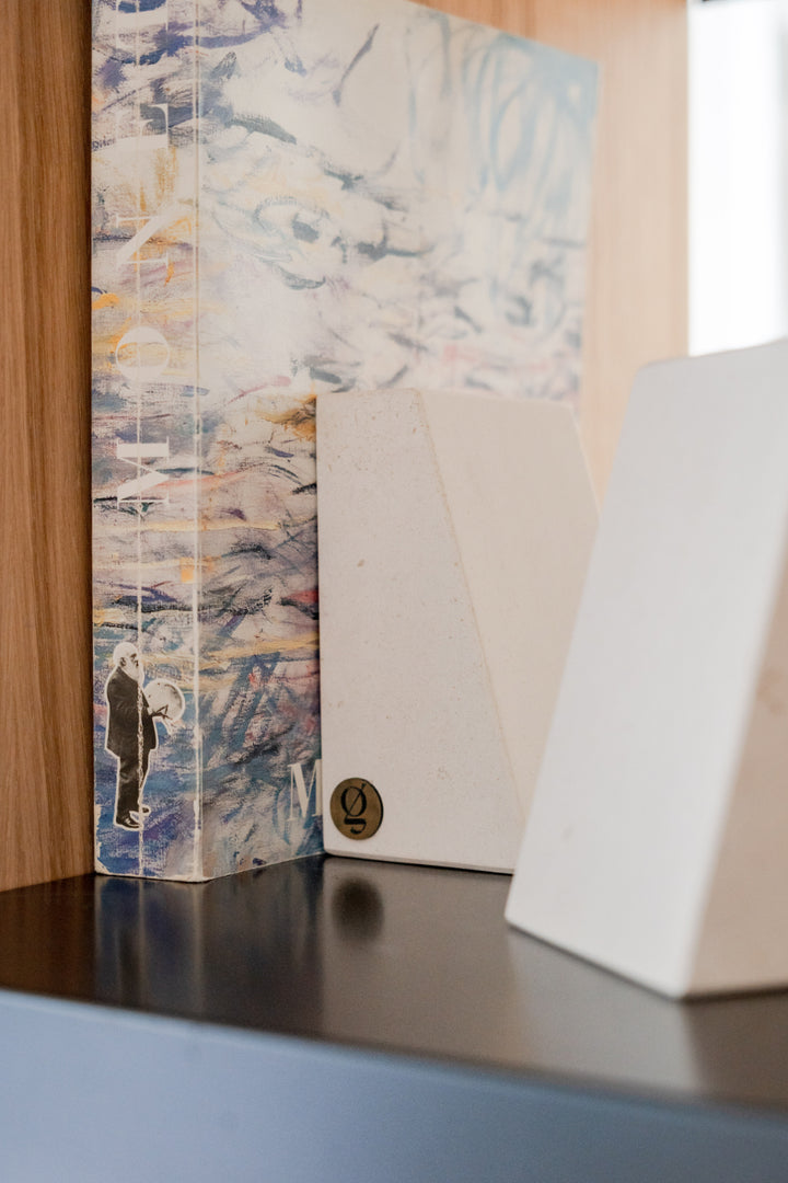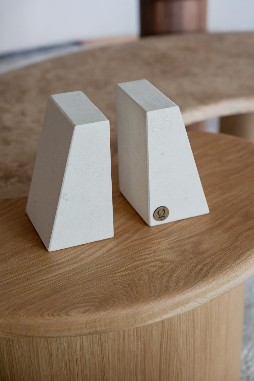 Sujetalibros elaborado en mármol natural, con una silueta geométrica que aporta equilibrio y serenidad. Su peso y pureza de líneas los convierten en piezas funcionales y escultóricas, creadas de forma artesanal y con impacto social. Funciona tanto de forma independiente como combinado con su pareja o con el sujetablibros Arco.