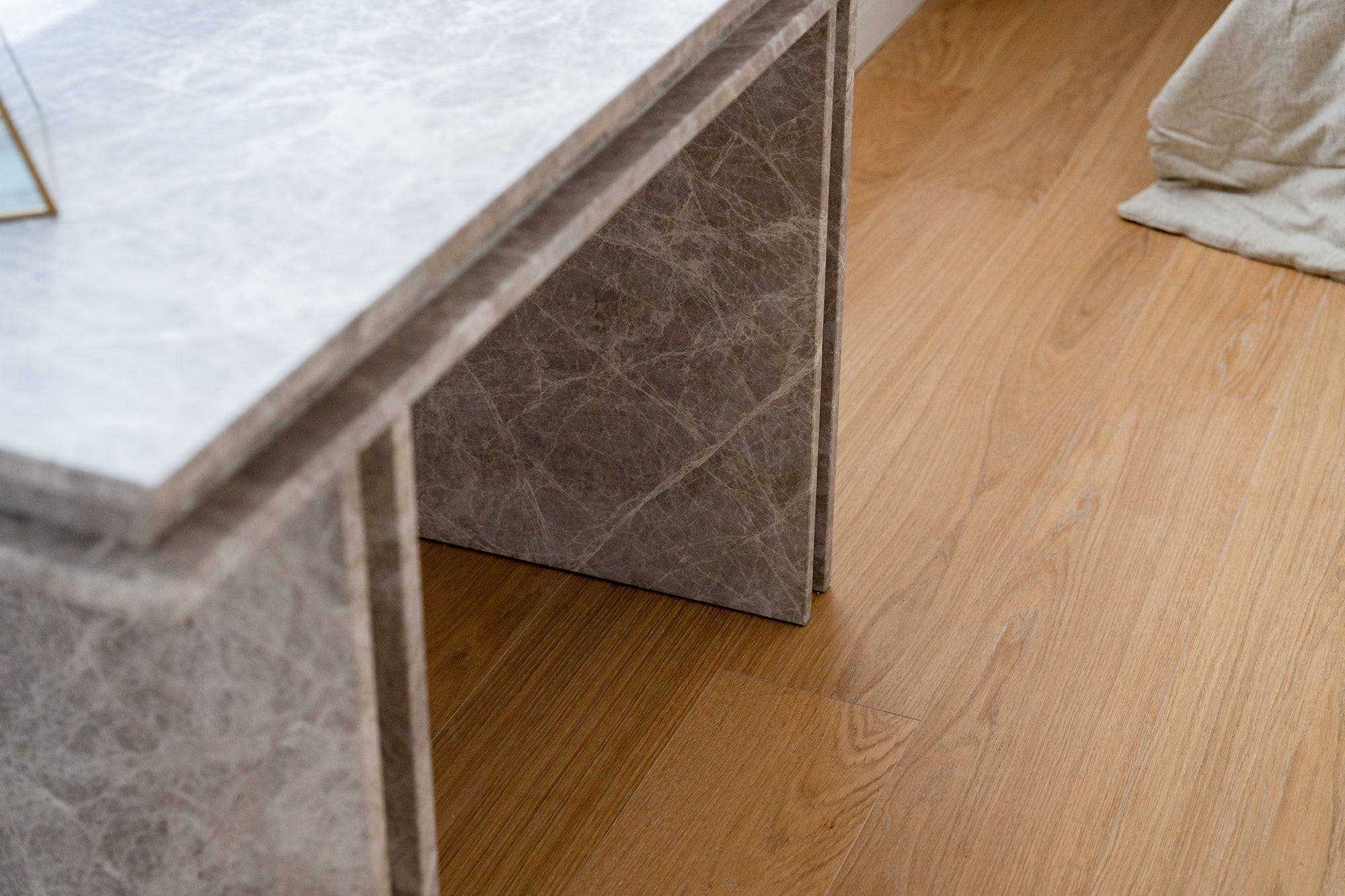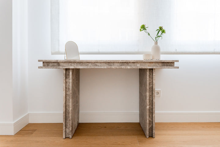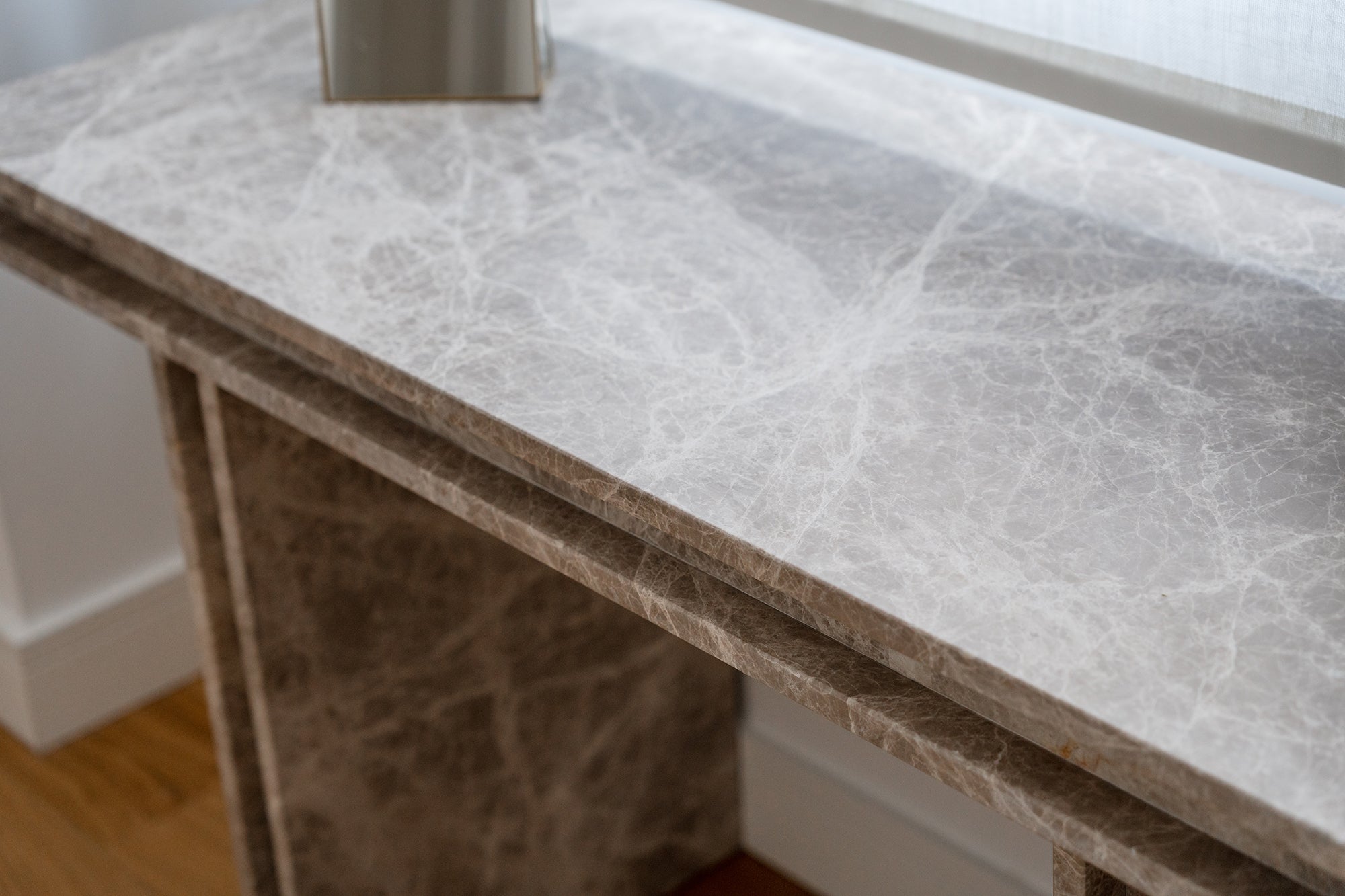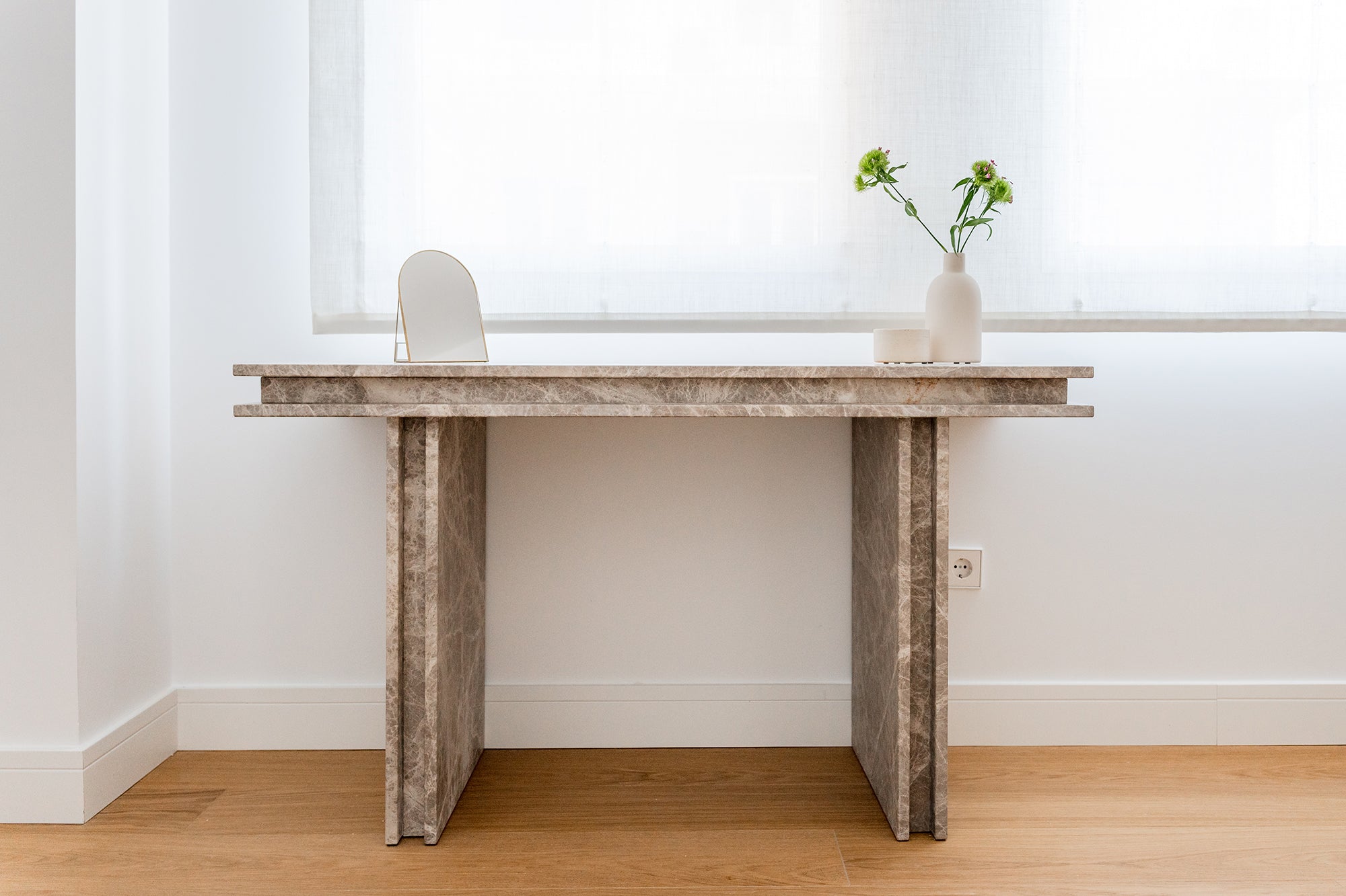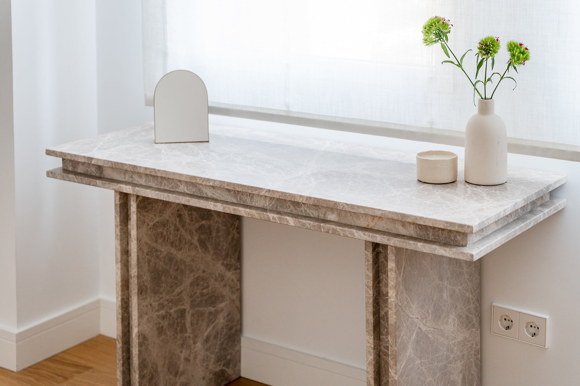 La consola Trazo combina la solidez del mármol con la ligereza del diseño arquitectónico. Sus planos se intersectan con precisión, generando una estructura equilibrada que parece flotar sobre sí misma.